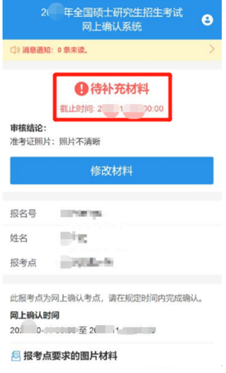 (二)待补充材料:未通过初次审核、须补充材料的考生,登录系统后可看到如下页面。考生须根据提示在规定时间内登陆系统,按照确认流程重新上传“未通过审核的图片材料”提交审核。逾期视为自动放弃报名资格。